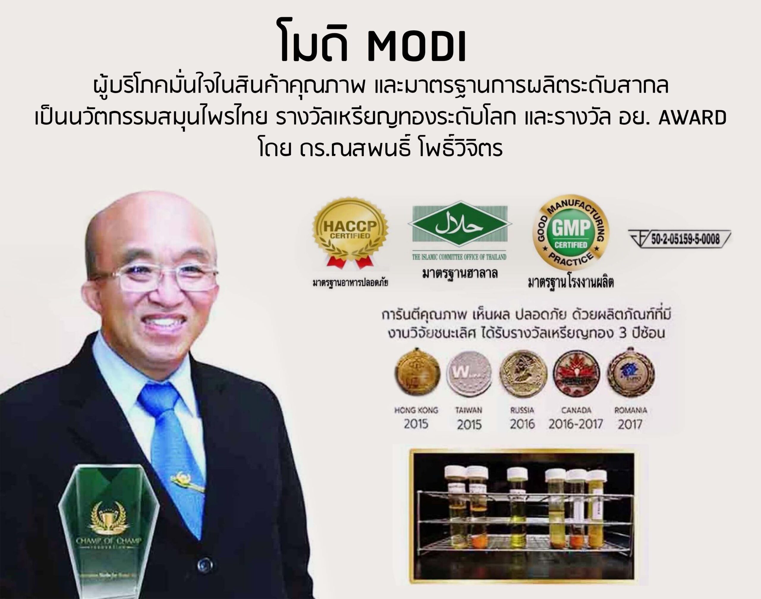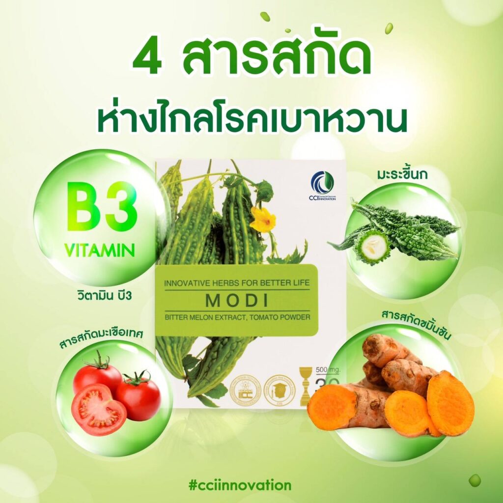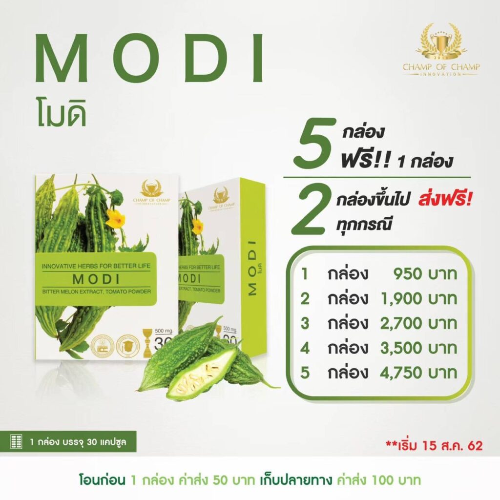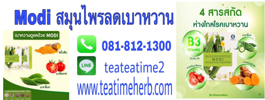 นวัตกรรมสมุนไพรไทย เพื่อสุขภาพ BY TeatimeHerb นวัตกรรมสมุนไพรไทย เพื่อสุขภาพ โรคเบาหวาน เกิดจากการทำงานของ “ฮอร์โมนอินซูลิน (INSULIN) ของระบบร่างกายทำงานผิดปกติ และแปรปรวน ส่งผลให้ อินซูลิน ซึ่งมีหน้าที่นำน้ำตาลในเลือดเข้าสู่เซลต่างๆ เพื่อนำไปใช้เป็นพลังงาน เกิดการคั่งของระดับน้ำตาลในเส้นเลือดแดง และการทำงานไม่ได้เต็มประสิทธิภาพ ส่งผลทำให้ระบบอวัยวะต่างๆในร่างกายแปรปรวนและเสื่อม ซึ่งทำให้เกิดภาวะโรคเบาหวานและอาการแทรกซ้อน ต่อมา เมื่อร่างกายคุณ .. มีสัญญานอันตรายเตือนภัย จากโรคเบาหวาน และ ระดับน้ำตาลในเลือดสูงผิดปกติ ผลิตภัณฑ์สมุนไพร เสริมอาหาร โมดิ Modi เหมาะสำหรับผู้มีภาวะเสี่ยงต่อโรคเบาหวาน ระดับน้ำตาลในกระแสเลือดสูงเห็นผลและดีขึ้น ด้วย ผลิตภัณฑ์เสริมอาหาร โมดิ Modi เป็นสารสกัดจากมะระขี้นก(Bitter Melon Extract) ผงมะเขือเทศ(Tomato Power) ขมิ้นชันสกัด(Turmeric Extract) ไนอาซิน วิตามินB3(Niacin Vitamin B3) ซึ่งสารสกัดดังกล่าวจะทำหน้าที่คล้ายอินซูลิน ช่วยผลิตน้ำตาลเข้าสู่เซลและทำให้เกิดการเผาผลาญ ผลงานวิจัย นวัตกรรมสมุนไพรไทยเพื่อสุขภาพ โดย ดร.ณสพล โพธิ์วิจิตร (บริษัท ซีซีไอ อินเตอร์เนชั่นแนล จำกัด) 4 สารสกัด ใน โมดิ MODI ..ช่วยลดระดับน้ำตาล ..ห่างไกล เบาหวาน โมดิ MODI ผู้บริโภคมั่นใจในสินค้าคุณภาพ และมาตรฐานการผลิตระดับสากล เป็น "นวัตกรรมสมุนไพรไทย" รางวัลเหรียญทองระดับโลก และรางวัล อย.AWARD โดย ดร.ณสพล โพธิ์วิจิตร ผลิตภัณฑ์เสริมอาหาร โมดิ MODI กับ โรคเบาหวาน Add Your Heading Text Here Add Your Heading Text Here รีวิว จากผู้ใช้จริง ผลิตภัณฑ์เสริมอาหาร โมดิ MODI โมดิ Modi ( 1 กล่อง บรรจุ 30 แคปซูล )1 กล่อง ราคา 950 บาท2 กล่อง ราคา 1,900 บาท 3 กล่อง ราคา 2,700 บาท 4 กล่อง ราคา 3,500 บาท 5 กล่อง ราคา 4,750 บาท(ฟรีค่าจัดส่ง 50 บาท)[ โปรโมชั่นพิเศษ ]** 5 กล่อง แถมฟรี !! เพิ่ม 1 กล่อง ** ***2 กล่องขึ้นไป ส่งฟรี ทุกกรณี *** [ โปรโมชั่นพิเศษ ] โมดิ Modi ( 1 กล่อง บรรจุ 30 แคปซูล ) สั่งซื้อ คลิ๊กที่นี่ Line @ สอบถาม Facebookติดต่อ 081-812-1300 Website Instagram การชำระสินค้า / บริการ ** สาระน่ารู้เกี่ยวกับสุขภาพ ** รู้ได้อย่างไร...ว่าเสี่ยงจะเป็นโรคเบาหวาน สมุนไพร โมดิ Modi เหมาะสำหรับ ผู้มีภาวะเสี่ยงต่อโรคเบาหวาน ระดับน้ำตาลในกระแสเลือดสูง